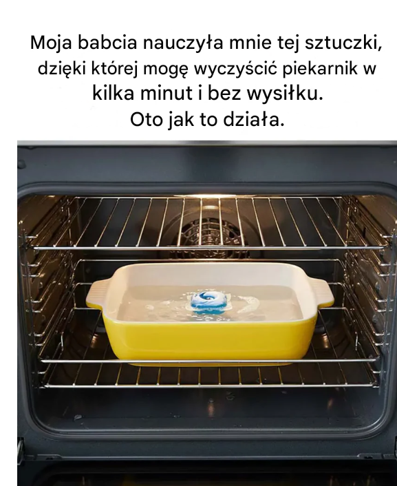 To babciny sekret, który mieści się w… kapsułce do zmywarki! Tak, tej, którą wsuwa się do przegródki na brudne naczynia. Dlaczego działa? Ponieważ te małe kapsułki zawierają silne środki odtłuszczające, które usuwają nawet najbardziej uporczywe zabrudzenia. A w połączeniu z parą, całe wnętrze piekarnika delikatnie zmiękcza. Niesamowite, prawda?1 kapsułka z detergentem do zmywarki (żel lub stała – obojętnie)